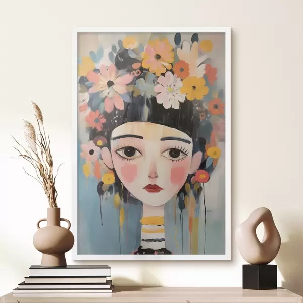 Poster Portret van een vrouw met bloemen in haar haar, in abstracte stijl f48935