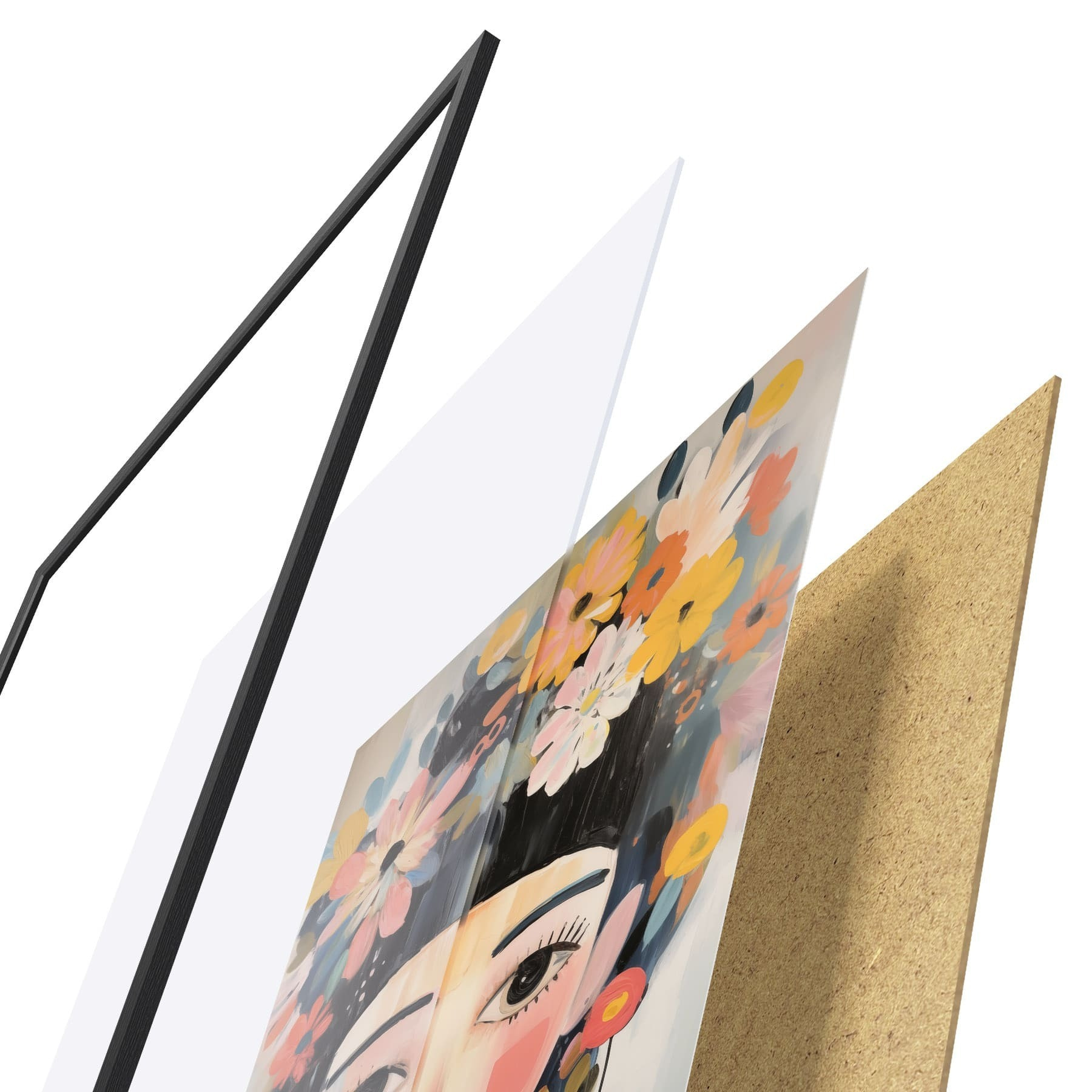 De poster bestaat uit een frame, plexiglas, geprinte afbeelding en spaanplaat achterkant. De poster kan meteen aan de muur worden gehangen dankzij de bevestigingen op de achterkant.
