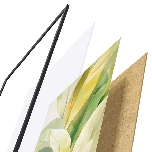 De poster bestaat uit een frame, plexiglas, geprinte afbeelding en spaanplaat achterkant. De poster kan meteen aan de muur worden gehangen dankzij de bevestigingen op de achterkant.