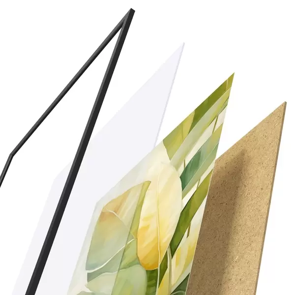 De poster bestaat uit een frame, plexiglas, geprinte afbeelding en spaanplaat achterkant. De poster kan meteen aan de muur worden gehangen dankzij de bevestigingen op de achterkant.