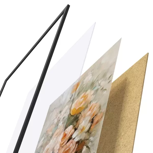 De poster bestaat uit een frame, plexiglas, geprinte afbeelding en spaanplaat achterkant. De poster kan meteen aan de muur worden gehangen dankzij de bevestigingen op de achterkant.