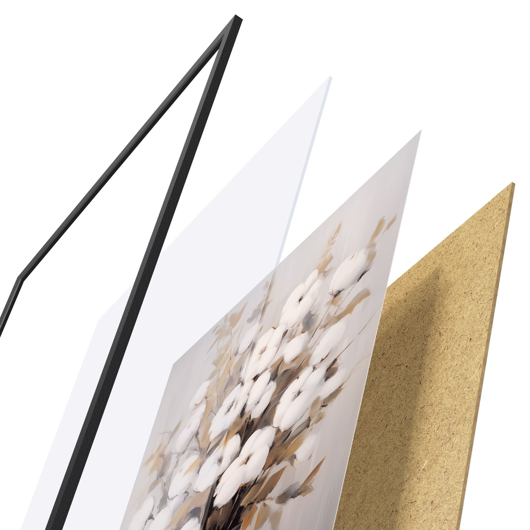 De poster bestaat uit een frame, plexiglas, geprinte afbeelding en spaanplaat achterkant. De poster kan meteen aan de muur worden gehangen dankzij de bevestigingen op de achterkant.
