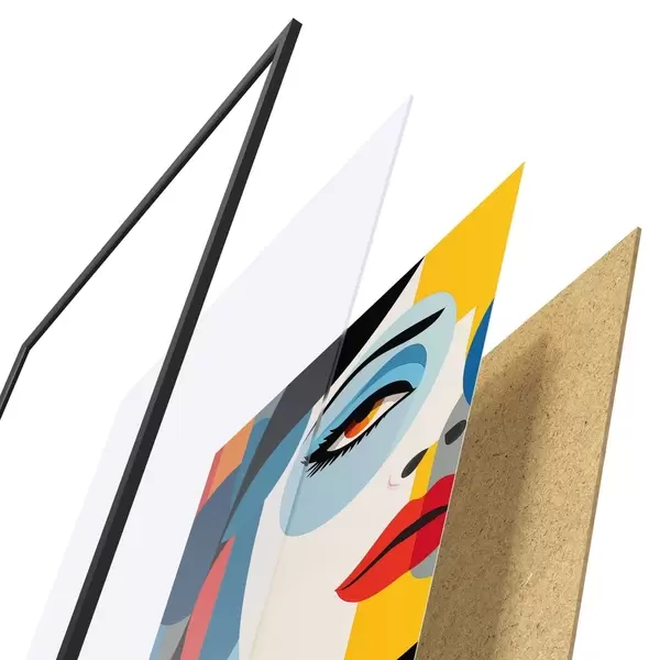 De poster bestaat uit een frame, plexiglas, geprinte afbeelding en spaanplaat achterkant. De poster kan meteen aan de muur worden gehangen dankzij de bevestigingen op de achterkant.