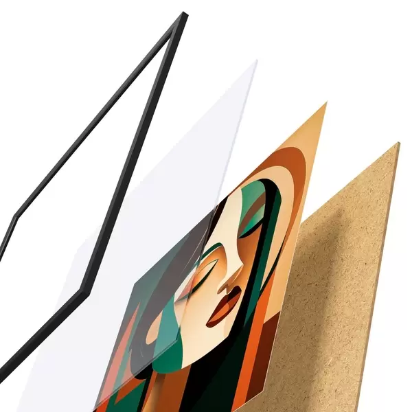 De poster bestaat uit een frame, plexiglas, geprinte afbeelding en spaanplaat achterkant. De poster kan meteen aan de muur worden gehangen dankzij de bevestigingen op de achterkant.