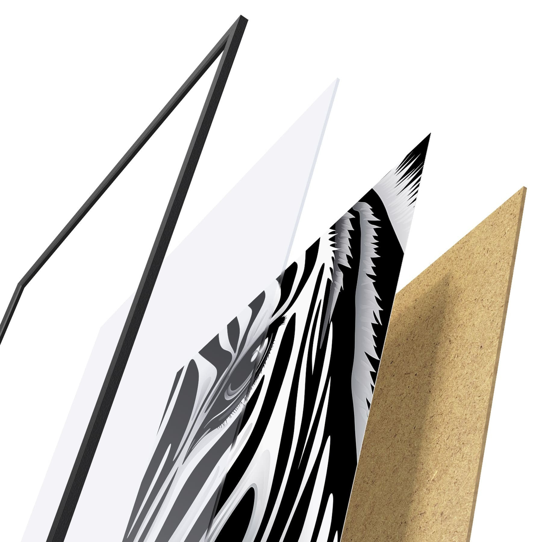 De poster bestaat uit een frame, plexiglas, geprinte afbeelding en spaanplaat achterkant. De poster kan meteen aan de muur worden gehangen dankzij de bevestigingen op de achterkant.