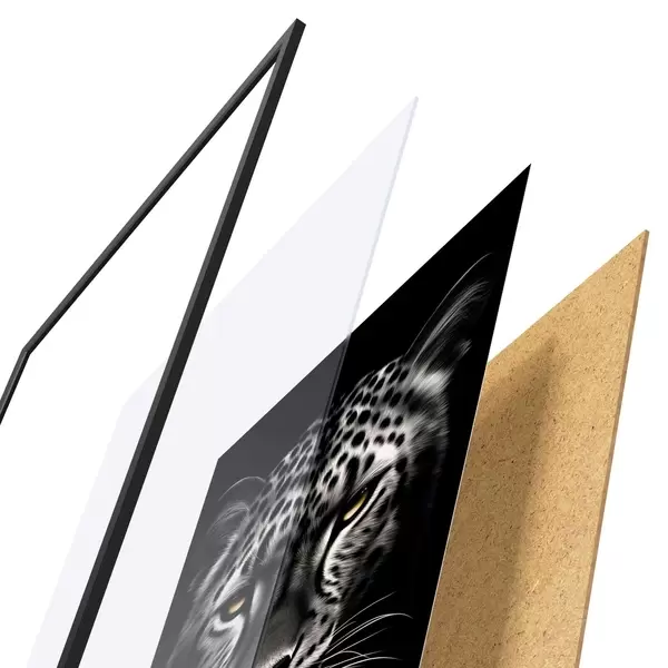 De poster bestaat uit een frame, plexiglas, geprinte afbeelding en spaanplaat achterkant. De poster kan meteen aan de muur worden gehangen dankzij de bevestigingen op de achterkant.