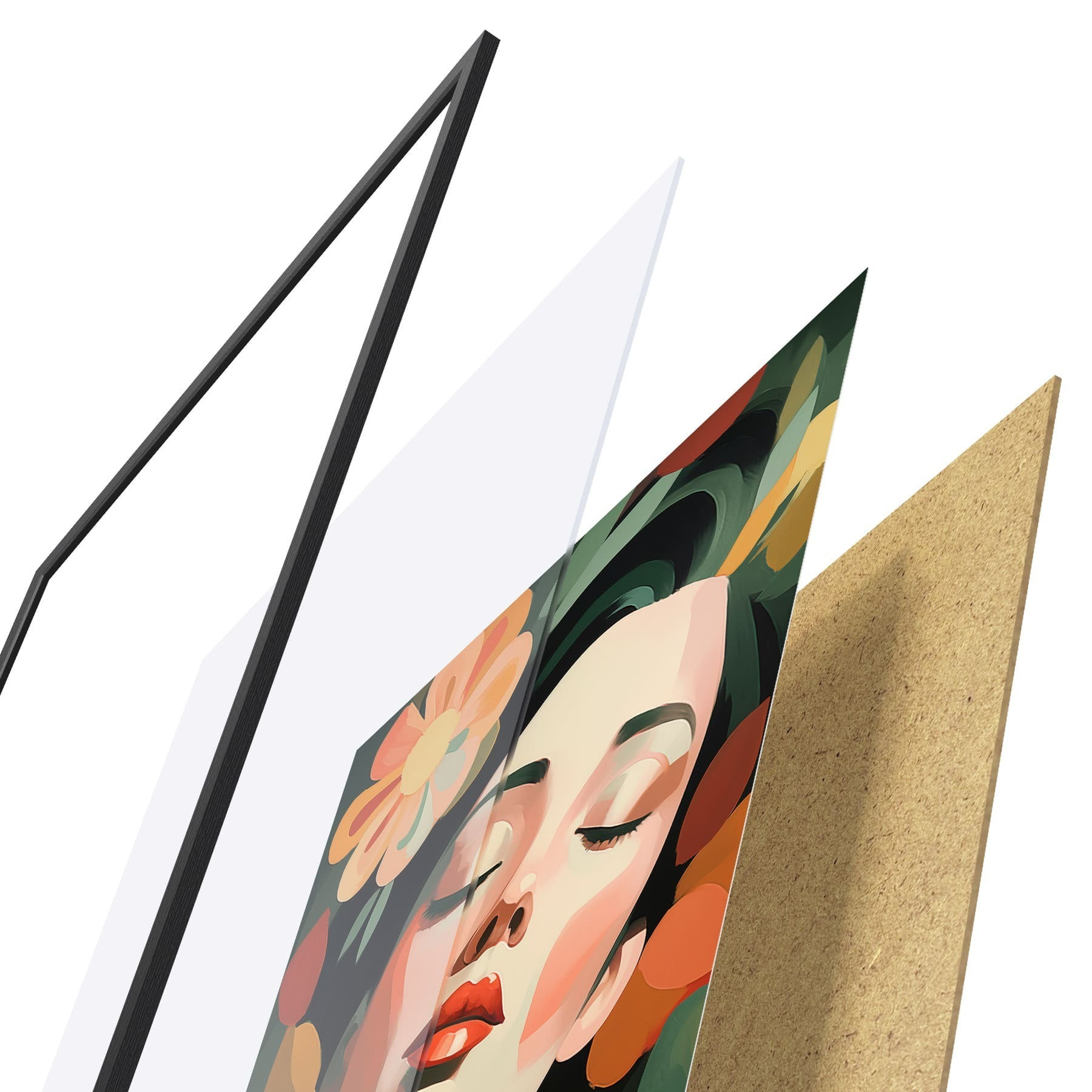 De poster bestaat uit een frame, plexiglas, geprinte afbeelding en spaanplaat achterkant. De poster kan meteen aan de muur worden gehangen dankzij de bevestigingen op de achterkant.