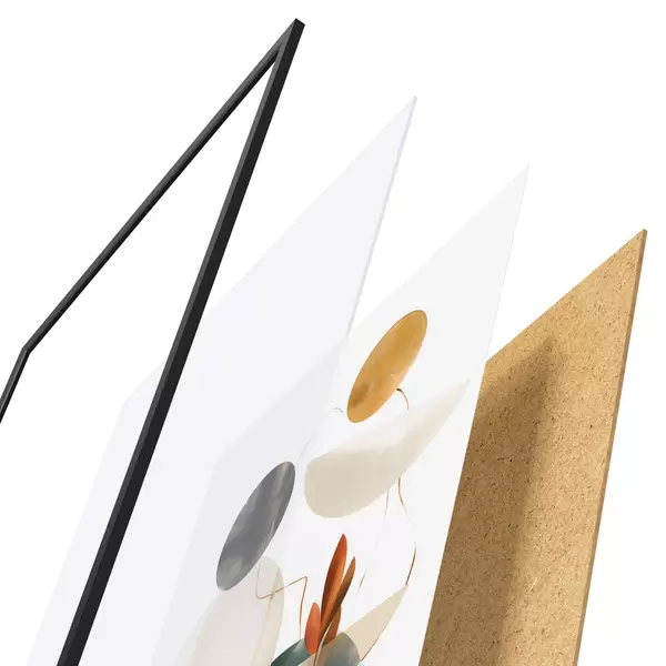 De poster bestaat uit een frame, plexiglas, geprinte afbeelding en spaanplaat achterkant. De poster kan meteen aan de muur worden gehangen dankzij de bevestigingen op de achterkant.