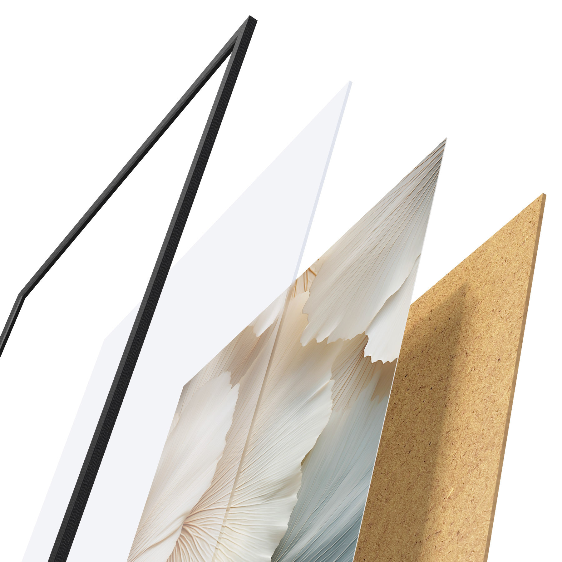 De poster bestaat uit een frame, plexiglas, geprinte afbeelding en spaanplaat achterkant. De poster kan meteen aan de muur worden gehangen dankzij de bevestigingen op de achterkant.