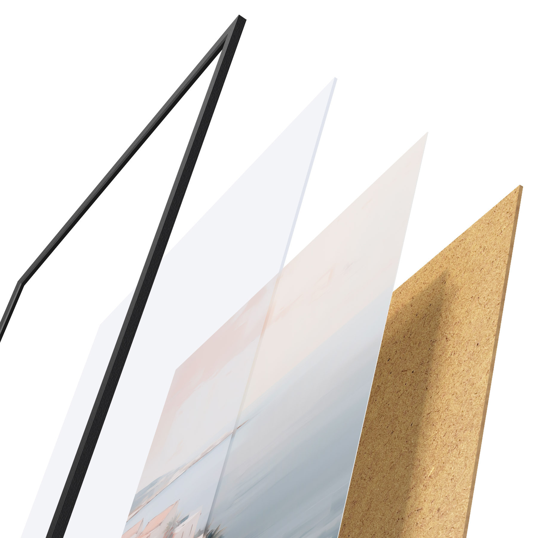De poster bestaat uit een frame, plexiglas, geprinte afbeelding en spaanplaat achterkant. De poster kan meteen aan de muur worden gehangen dankzij de bevestigingen op de achterkant.