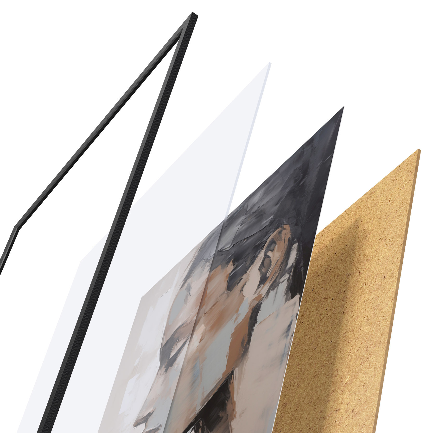 De poster bestaat uit een frame, plexiglas, geprinte afbeelding en spaanplaat achterkant. De poster kan meteen aan de muur worden gehangen dankzij de bevestigingen op de achterkant.