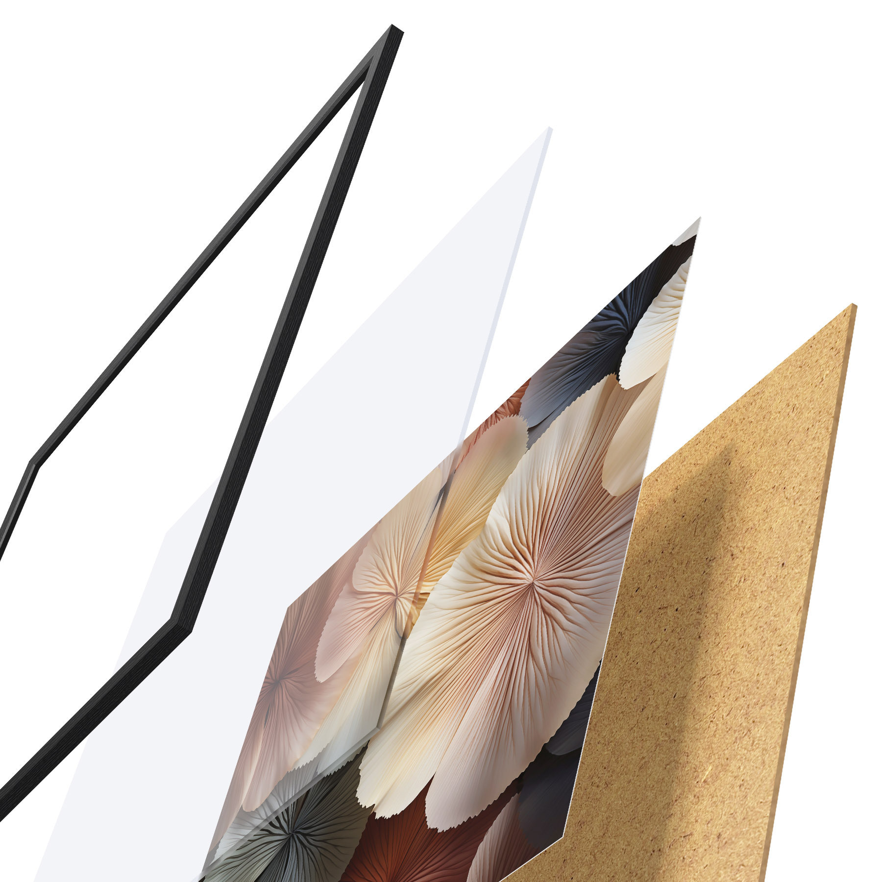 De poster bestaat uit een frame, plexiglas, geprinte afbeelding en spaanplaat achterkant. De poster kan meteen aan de muur worden gehangen dankzij de bevestigingen op de achterkant.