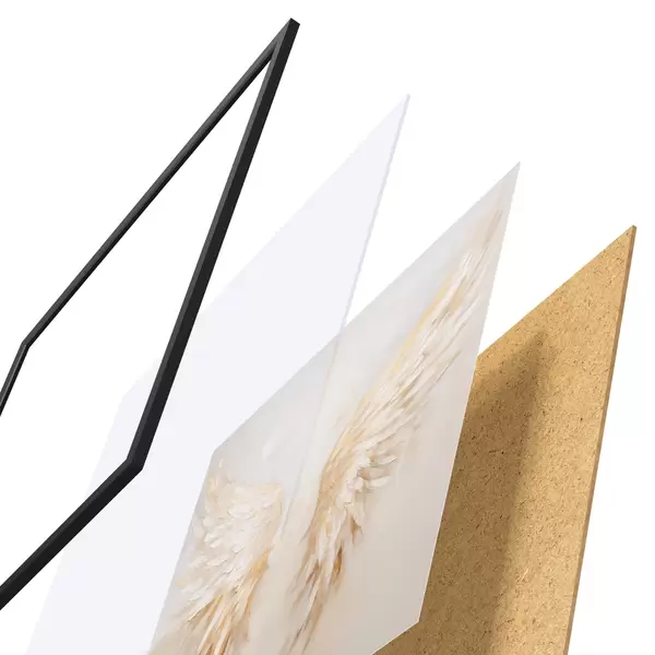 De poster bestaat uit een frame, plexiglas, geprinte afbeelding en spaanplaat achterkant. De poster kan meteen aan de muur worden gehangen dankzij de bevestigingen op de achterkant.