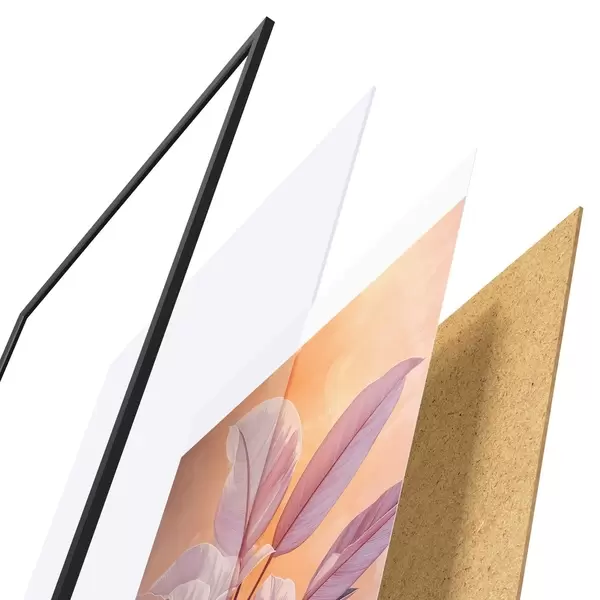 De poster bestaat uit een frame, plexiglas, geprinte afbeelding en spaanplaat achterkant. De poster kan meteen aan de muur worden gehangen dankzij de bevestigingen op de achterkant.