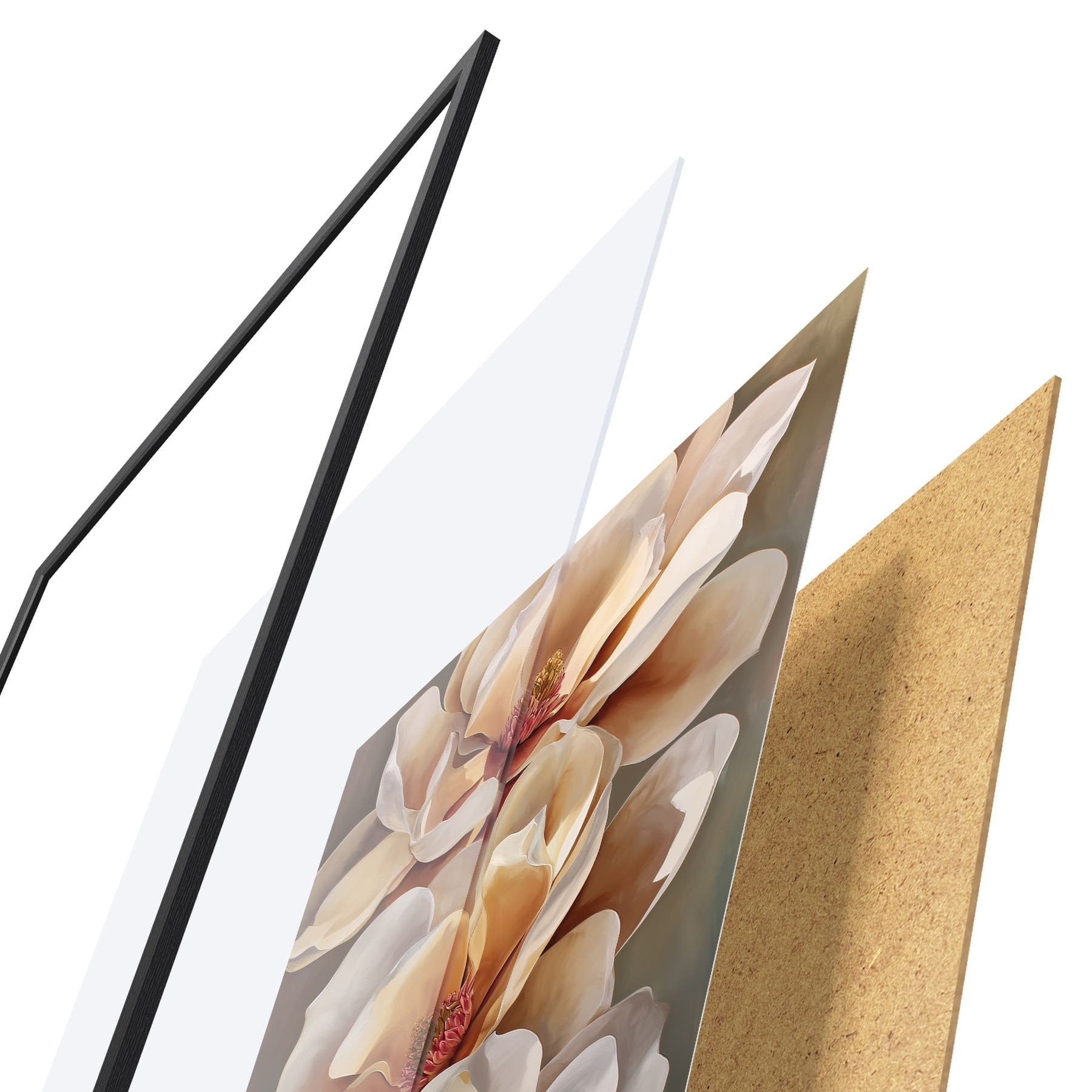 De poster bestaat uit een frame, plexiglas, geprinte afbeelding en spaanplaat achterkant. De poster kan meteen aan de muur worden gehangen dankzij de bevestigingen op de achterkant.