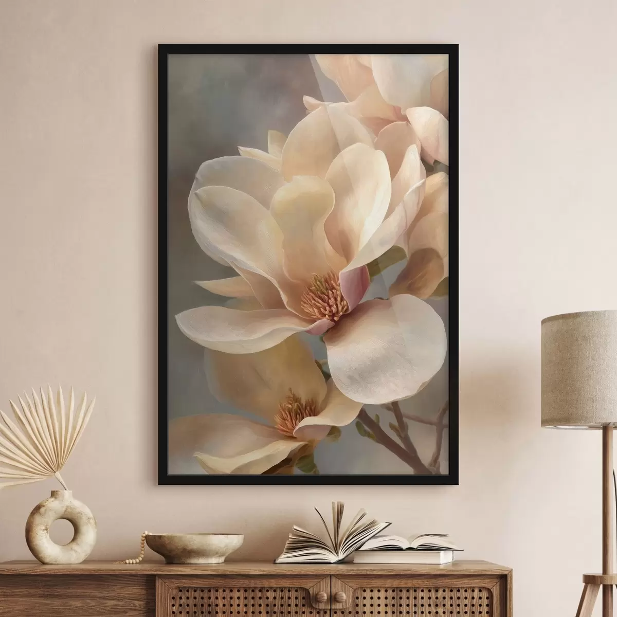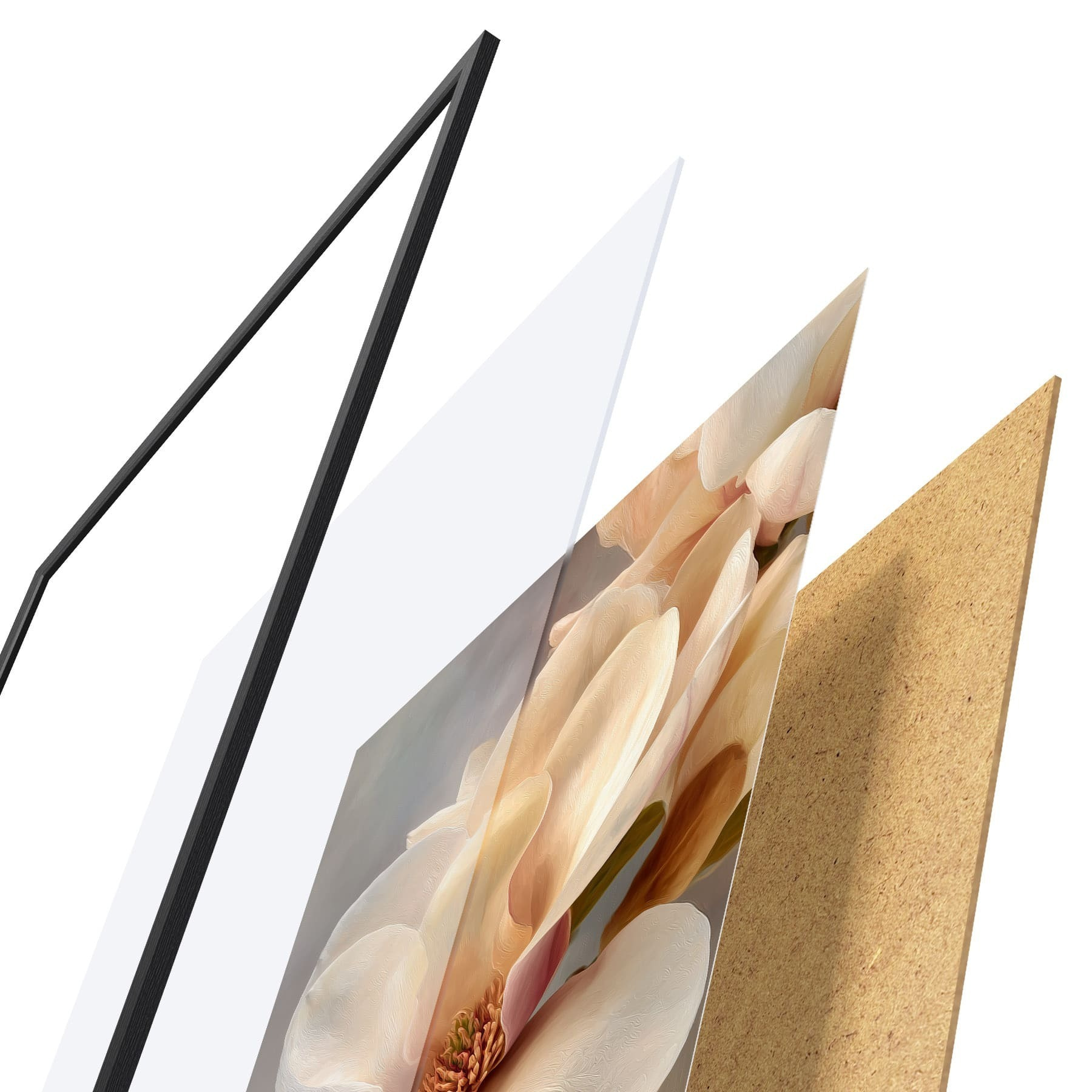De poster bestaat uit een frame, plexiglas, geprinte afbeelding en spaanplaat achterkant. De poster kan meteen aan de muur worden gehangen dankzij de bevestigingen op de achterkant.