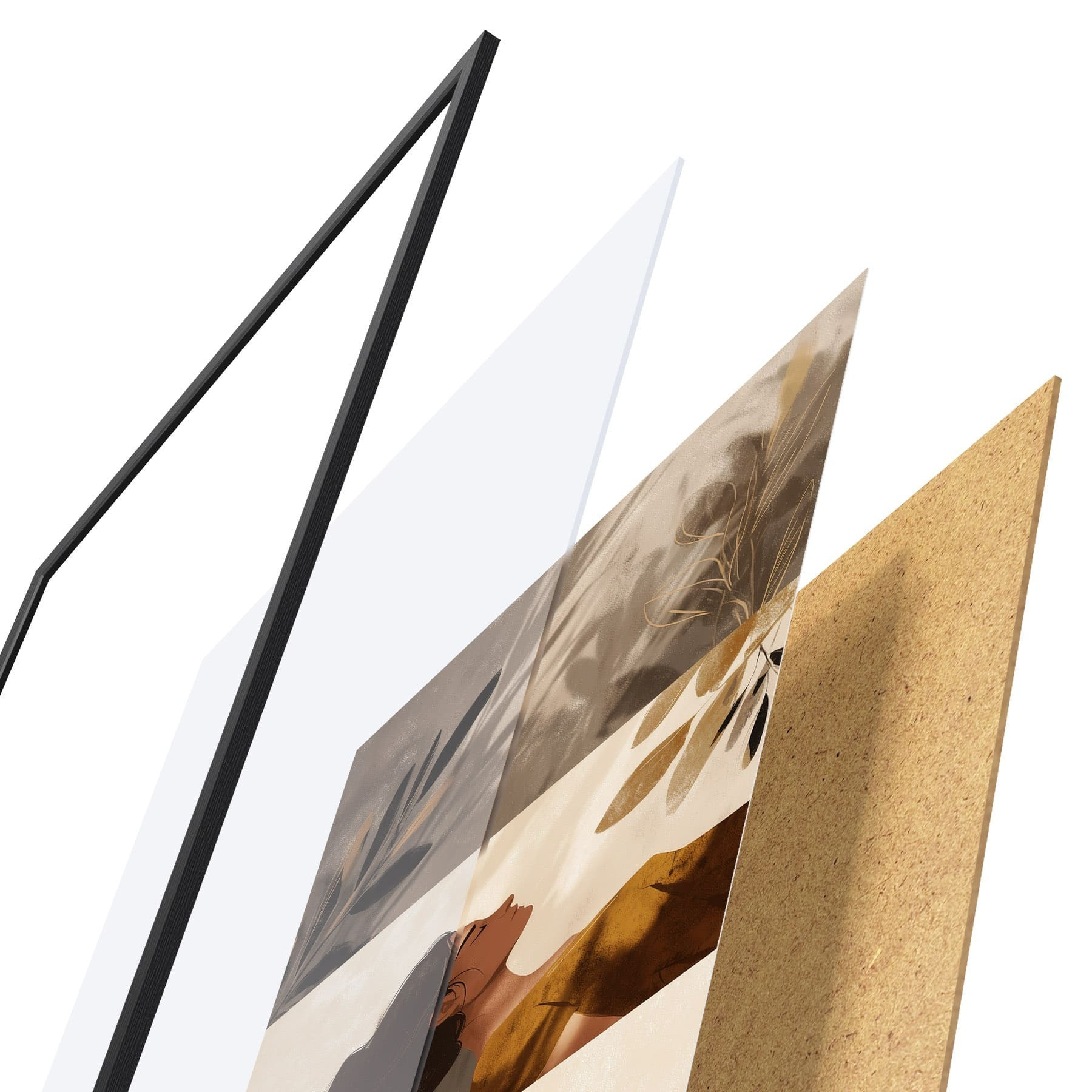 De poster bestaat uit een frame, plexiglas, geprinte afbeelding en spaanplaat achterkant. De poster kan meteen aan de muur worden gehangen dankzij de bevestigingen op de achterkant.