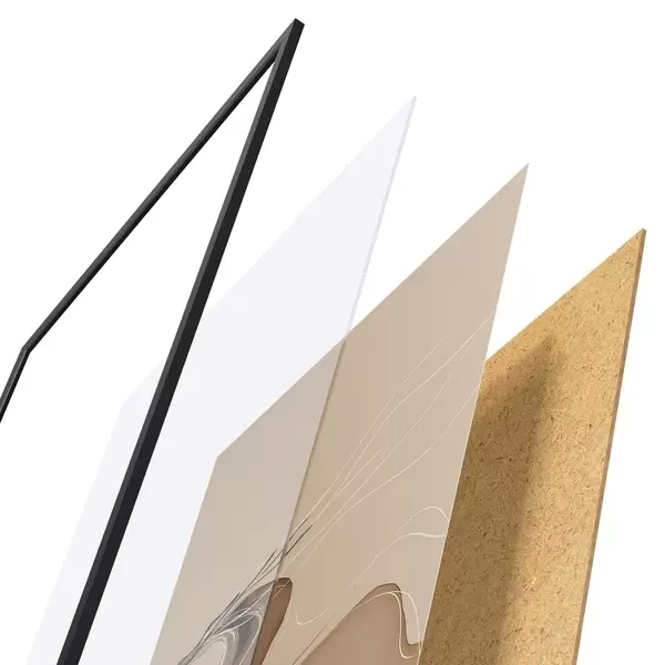 De poster bestaat uit een frame, plexiglas, geprinte afbeelding en spaanplaat achterkant. De poster kan meteen aan de muur worden gehangen dankzij de bevestigingen op de achterkant.