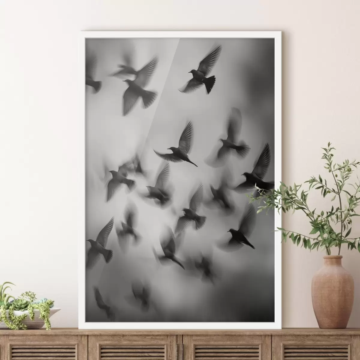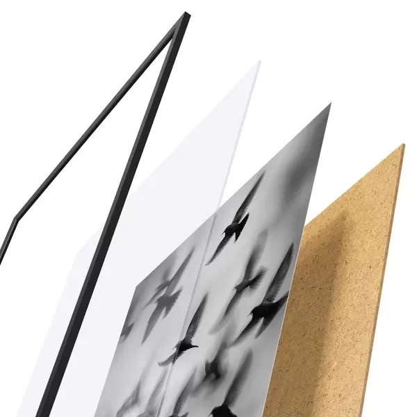 De poster bestaat uit een frame, plexiglas, geprinte afbeelding en spaanplaat achterkant. De poster kan meteen aan de muur worden gehangen dankzij de bevestigingen op de achterkant.