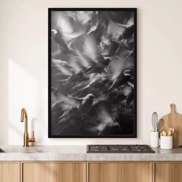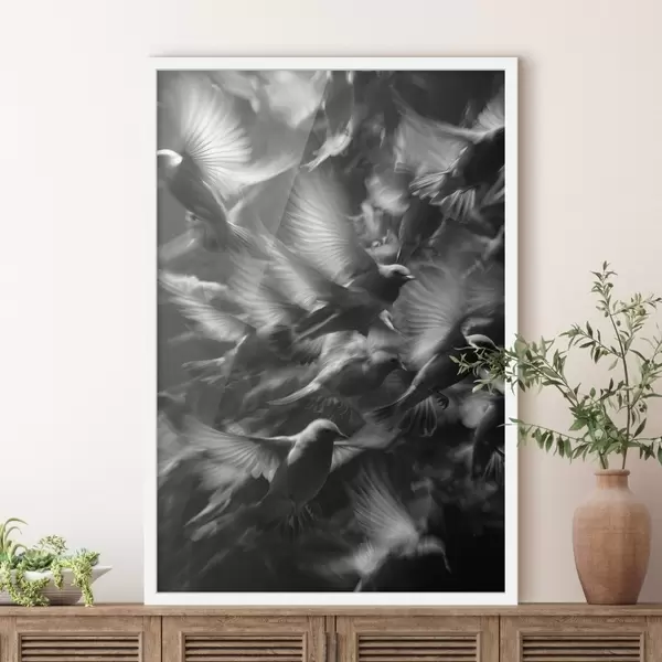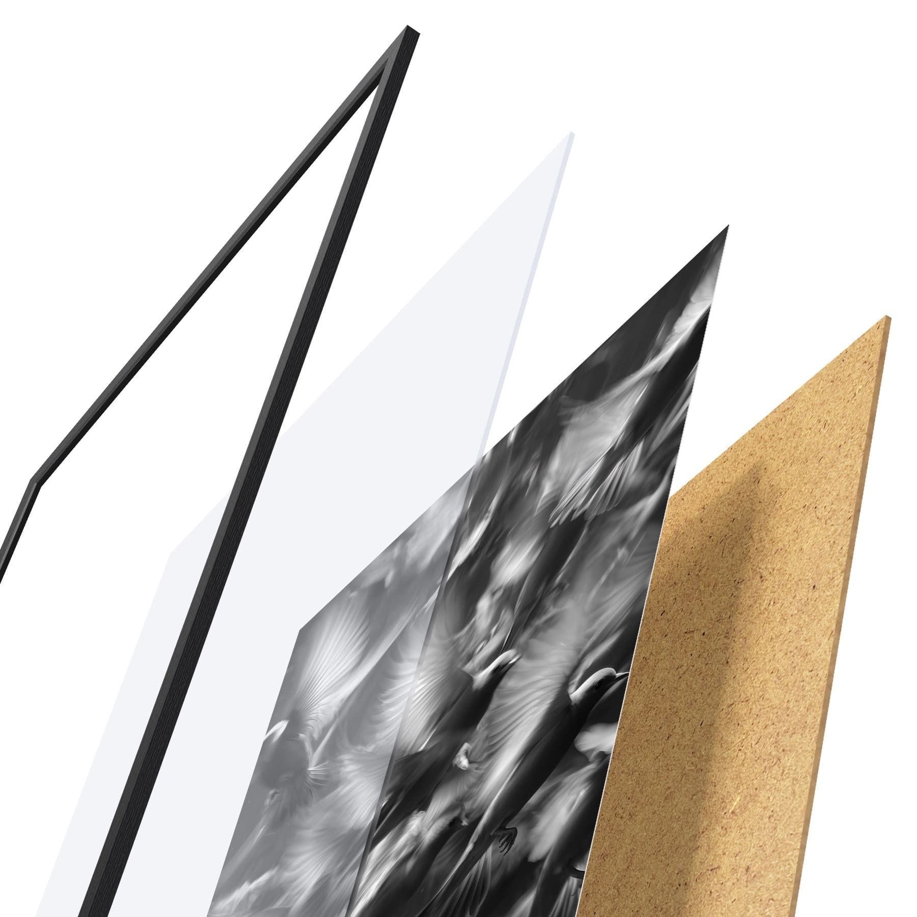 De poster bestaat uit een frame, plexiglas, geprinte afbeelding en spaanplaat achterkant. De poster kan meteen aan de muur worden gehangen dankzij de bevestigingen op de achterkant.