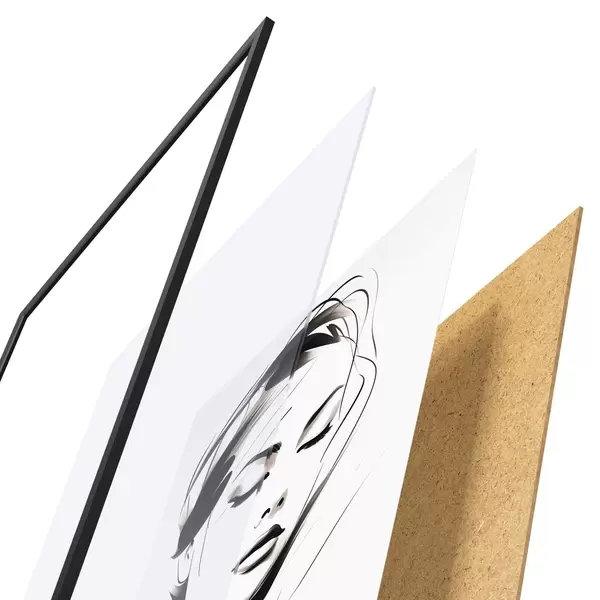 De poster bestaat uit een frame, plexiglas, geprinte afbeelding en spaanplaat achterkant. De poster kan meteen aan de muur worden gehangen dankzij de bevestigingen op de achterkant.