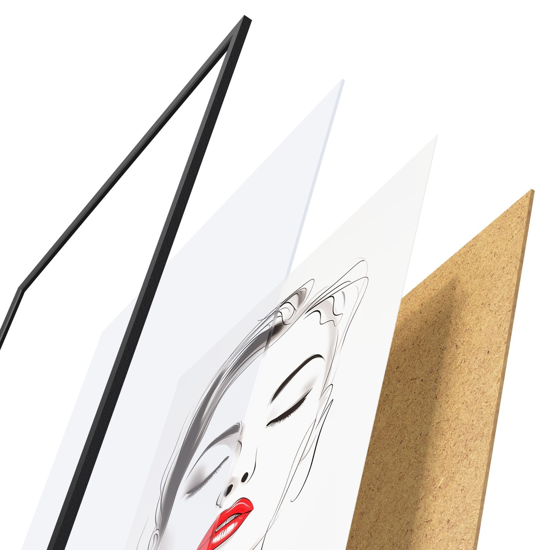 De poster bestaat uit een frame, plexiglas, geprinte afbeelding en spaanplaat achterkant. De poster kan meteen aan de muur worden gehangen dankzij de bevestigingen op de achterkant.