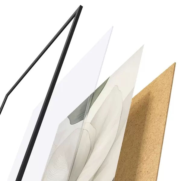 De poster bestaat uit een frame, plexiglas, geprinte afbeelding en spaanplaat achterkant. De poster kan meteen aan de muur worden gehangen dankzij de bevestigingen op de achterkant.
