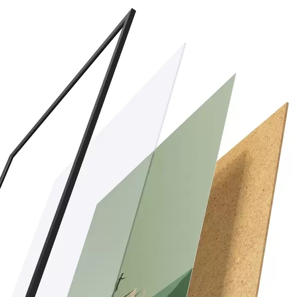 De poster bestaat uit een frame, plexiglas, geprinte afbeelding en spaanplaat achterkant. De poster kan meteen aan de muur worden gehangen dankzij de bevestigingen op de achterkant.