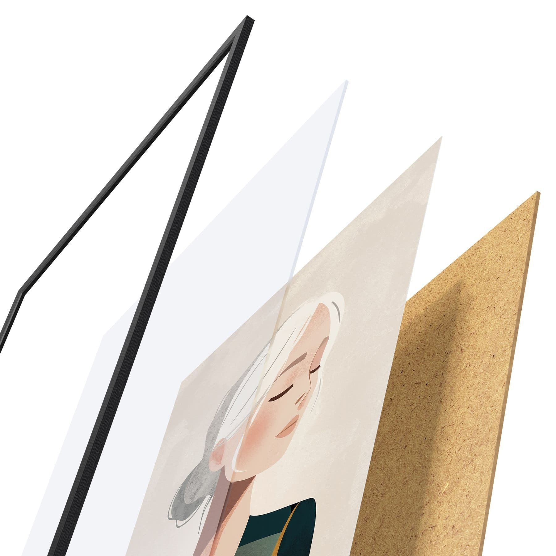 De poster bestaat uit een frame, plexiglas, geprinte afbeelding en spaanplaat achterkant. De poster kan meteen aan de muur worden gehangen dankzij de bevestigingen op de achterkant.