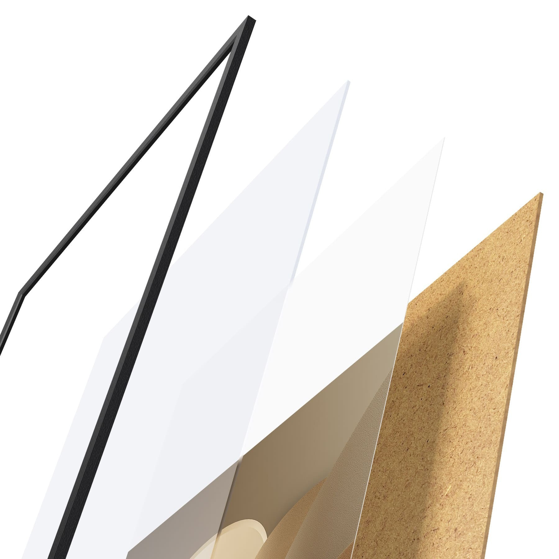 De poster bestaat uit een frame, plexiglas, geprinte afbeelding en spaanplaat achterkant. De poster kan meteen aan de muur worden gehangen dankzij de bevestigingen op de achterkant.