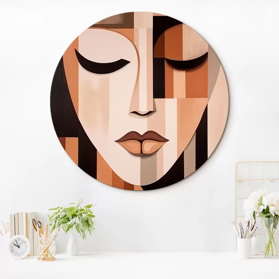 Ronde schilderijen Abstract portret van een vrouw met diepe donkere en warme tinten,