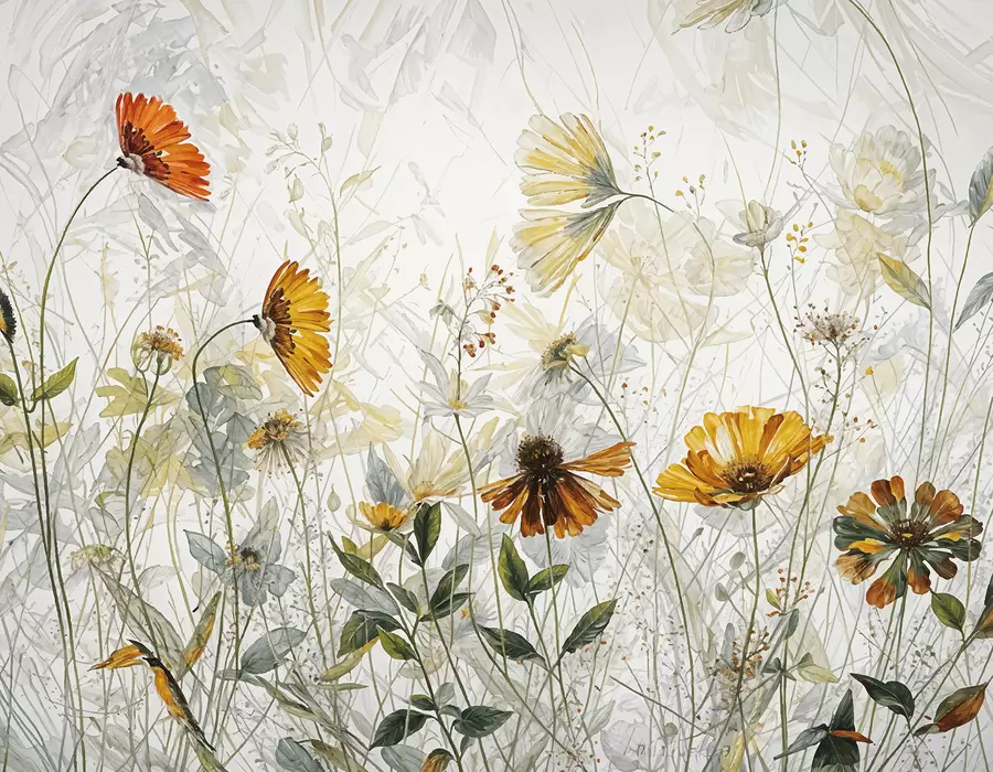 Muurschildering Zachte veldplanten en bloemenminimalisme