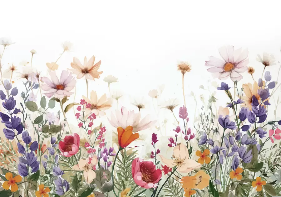 Muurschildering Een veld met levendige bloemen tegen een zachte, wazige achtergrond met delicate witte bloemen en piekerig gras