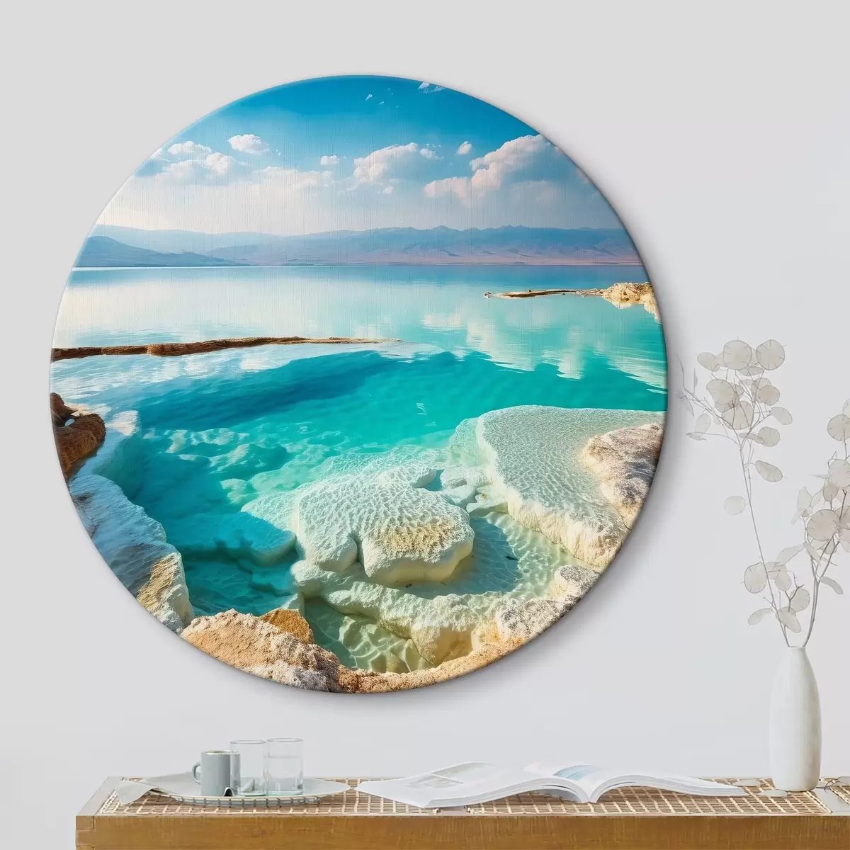 Ronde schilderijen De Dode Zee met bergen op de achtergrond r31109
