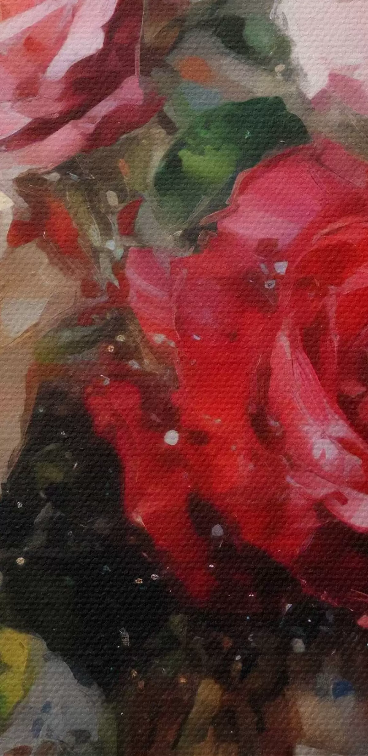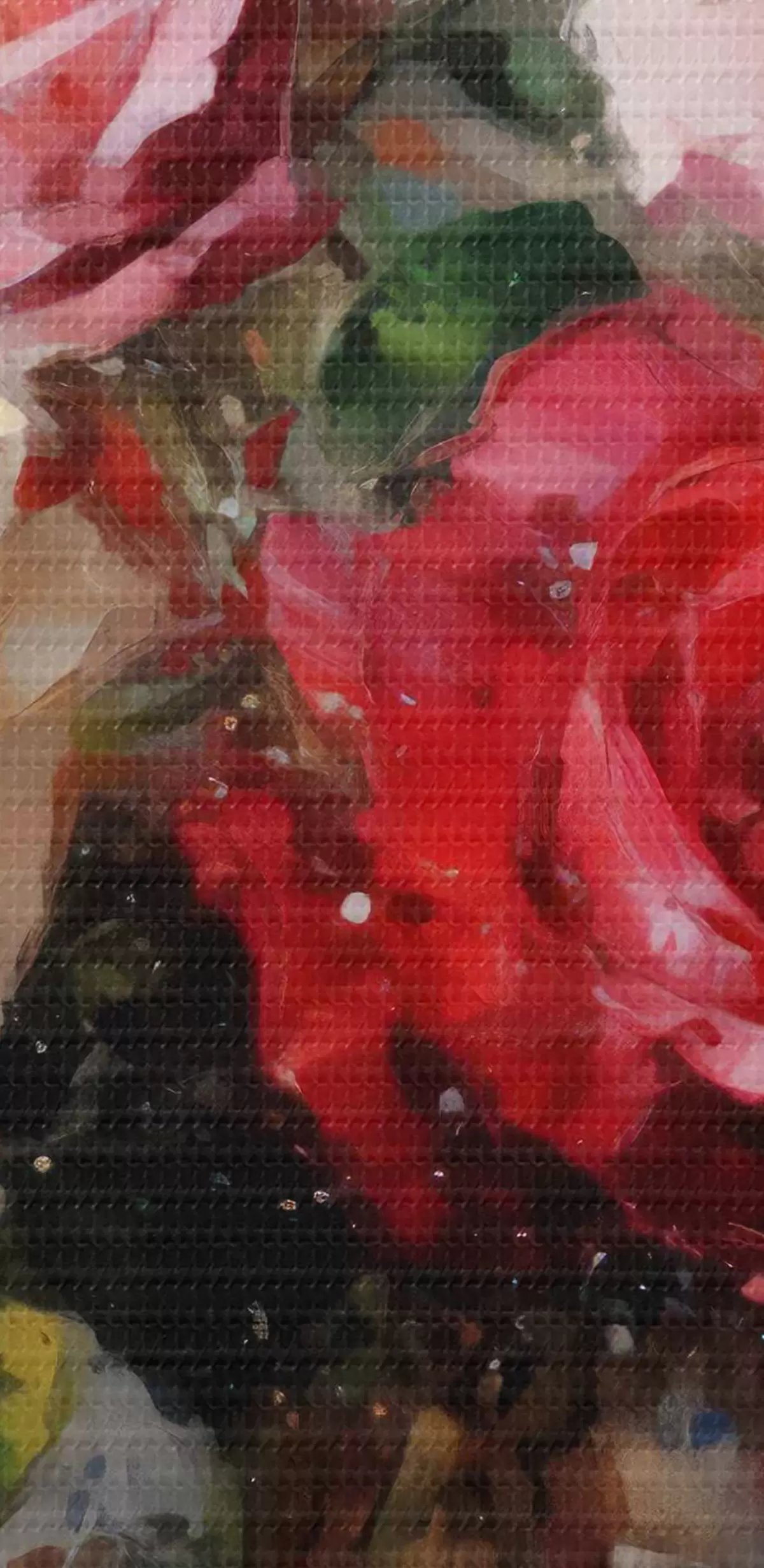 Het schilderij kan direct na ontvangst worden opgehangen. Het schilderij wordt opgespannen op een 2 cm breed houten spieraam.