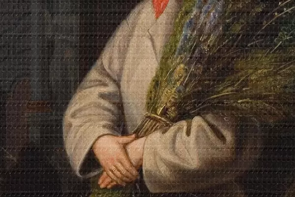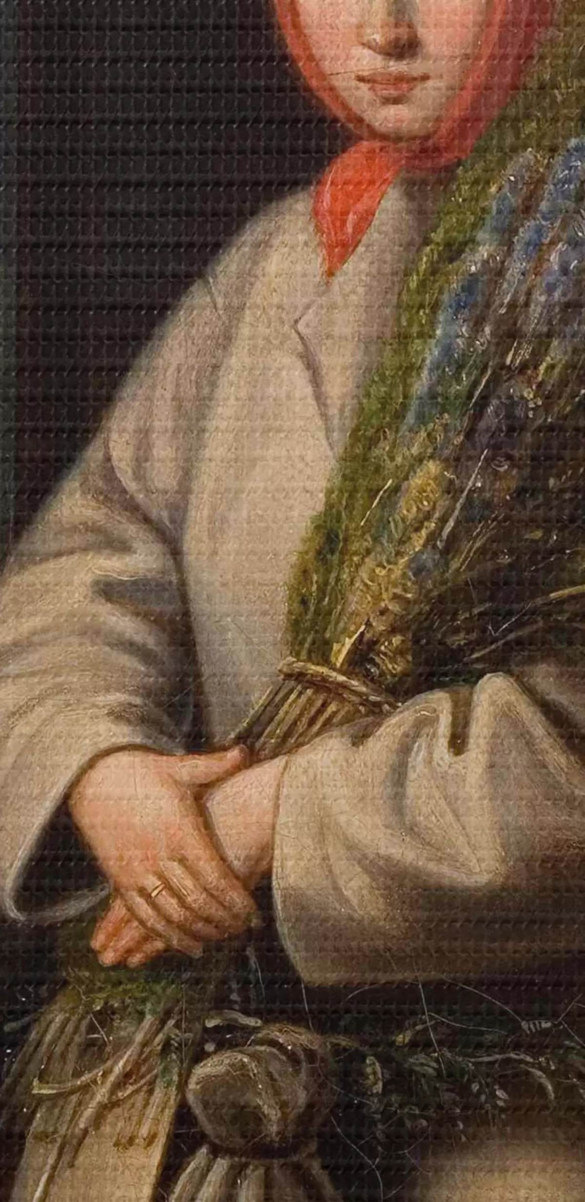 Het schilderij kan voorzichtig worden schoongeveegd met een droge zachte doek of spons; het wordt niet aanbevolen om natte producten te gebruiken. Het gebruik van een vochtige spons is alleen toegestaan als het schilderij gevernist is.