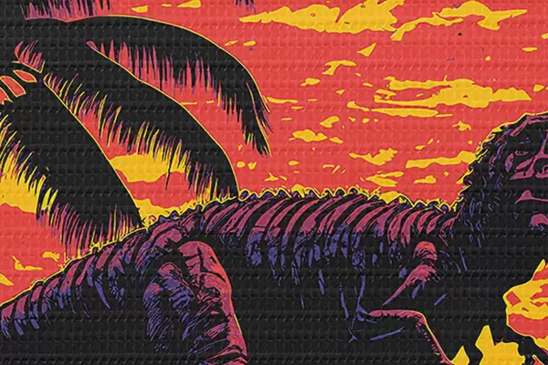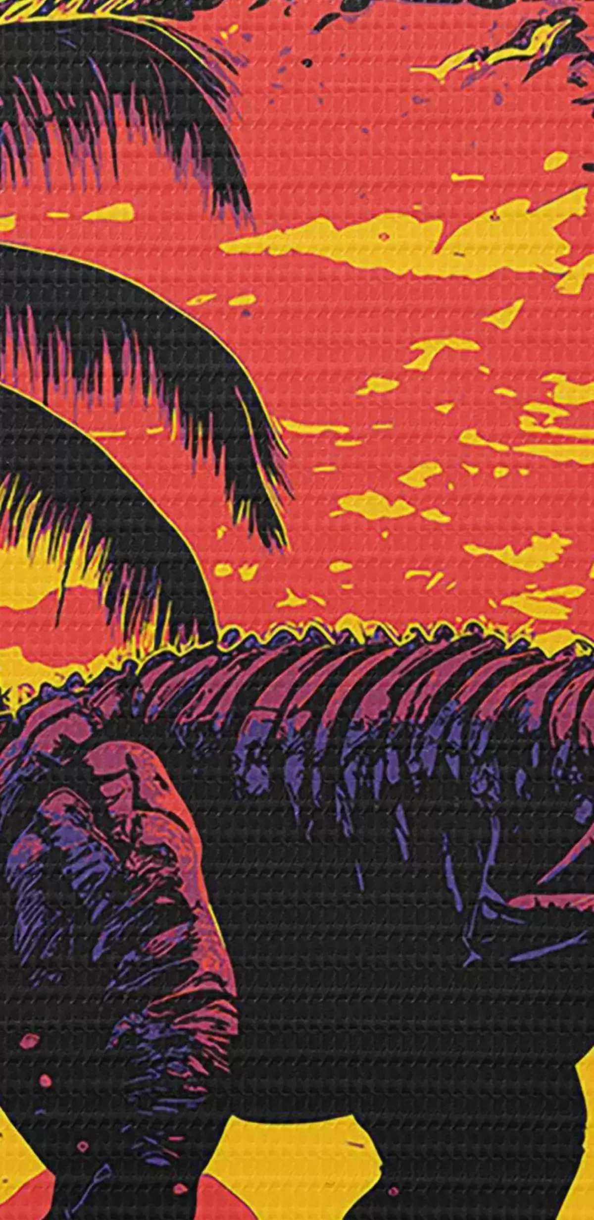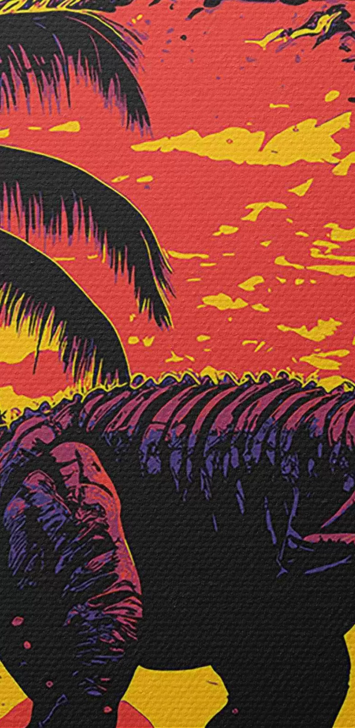 Ronde schilderijen Dinosaurus bij zonsondergang in de palmbomen Nr r33894