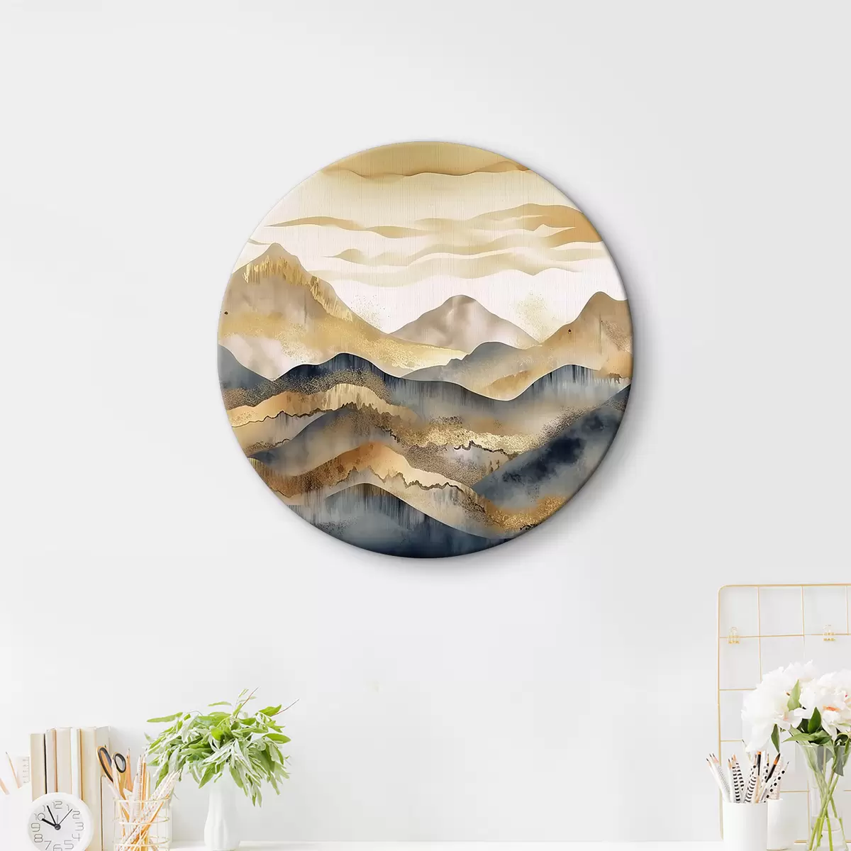 Ronde schilderijen Abstracte achtergrond van bergen in beige en grijs met gouden elementen op een witte achtergrond Nr r34462