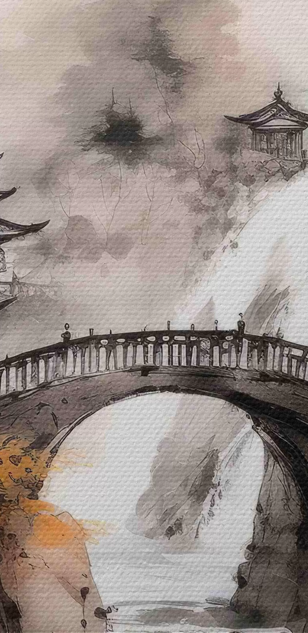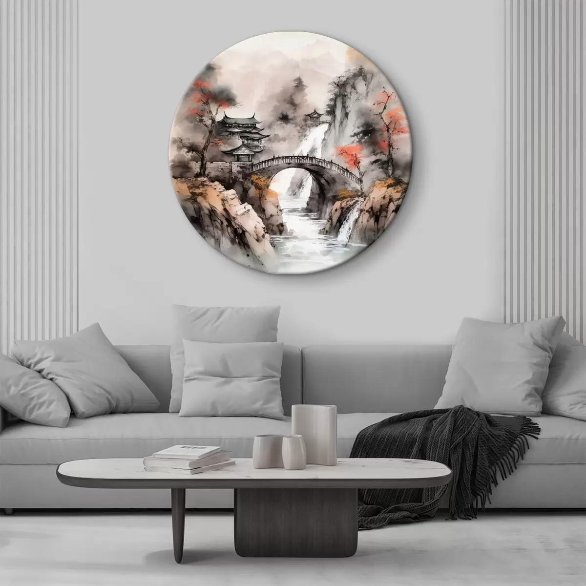 Ronde schilderijen Chinees landschap met een brug Nr r34627