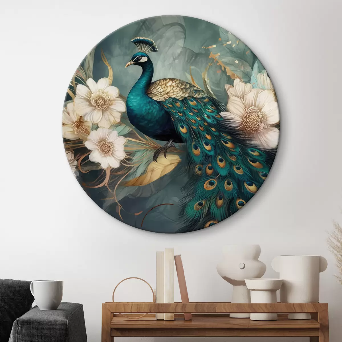 Ronde schilderijen Een prachtige pauw op een bloeiende tak r34866