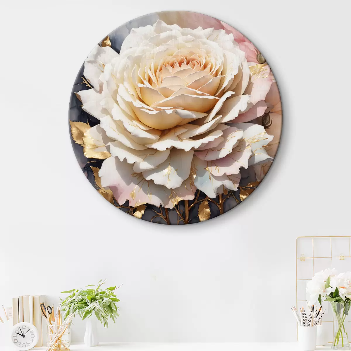 Ronde schilderijen Witte roos in aquarel met gouden bladeren Nr r35662