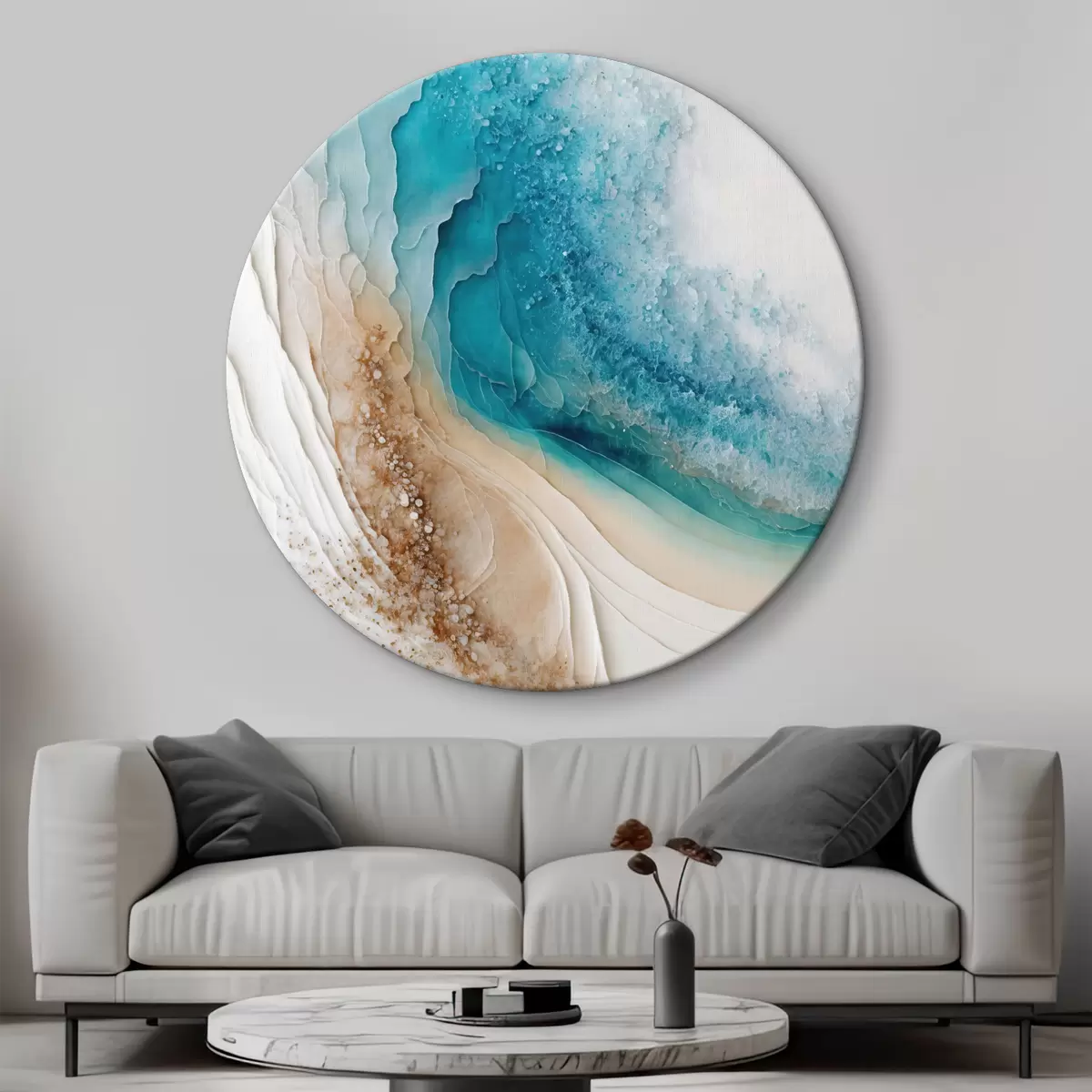 Ronde schilderijen Turquoise en witte vloeiende kunst r36029