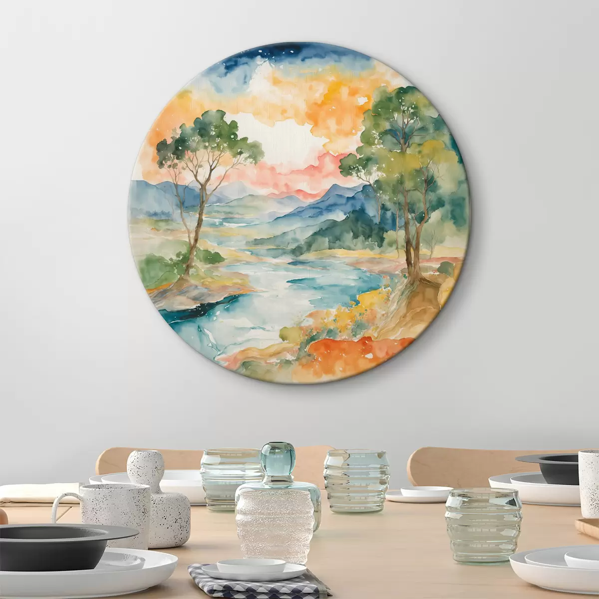 Ronde schilderijen Rivier en bomen in aquarel r36054