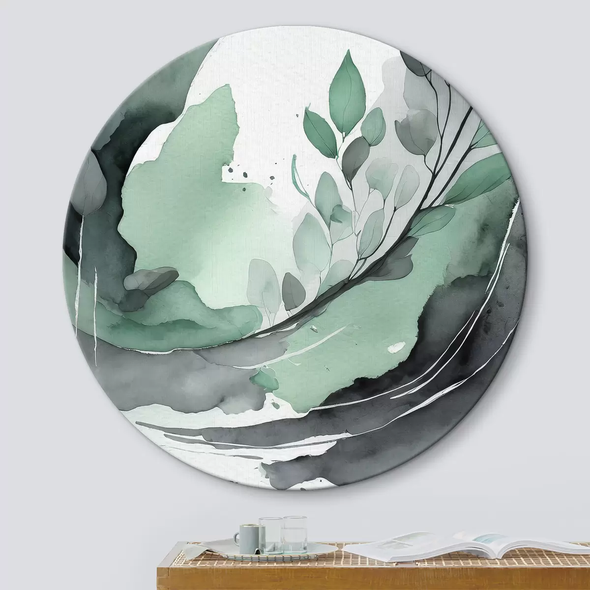 Ronde schilderijen Abstracte aquareltekening met een plant, natuurlijke groene en grijze kleuren Nr r36502