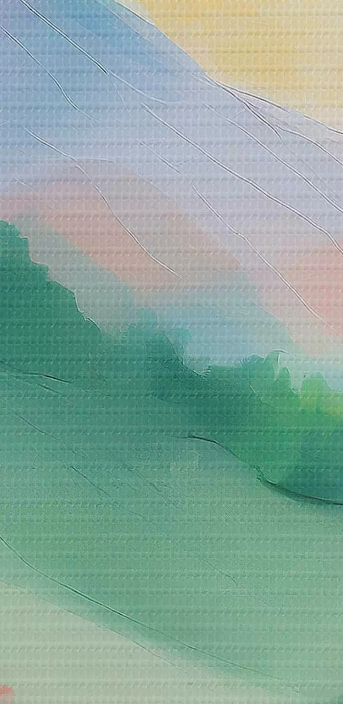 Ronde schilderijen Acryl tekening Natuur landschap, zonsondergang kleuren, bergen, bomen, weide r36505