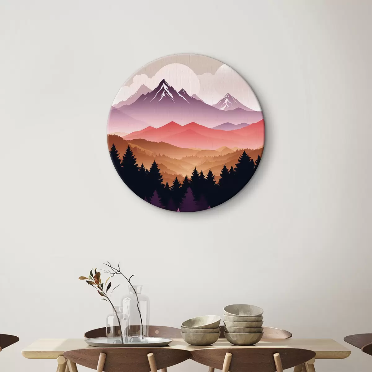 Ronde schilderijen Zonsondergang over de vredige bergen Nr r36527