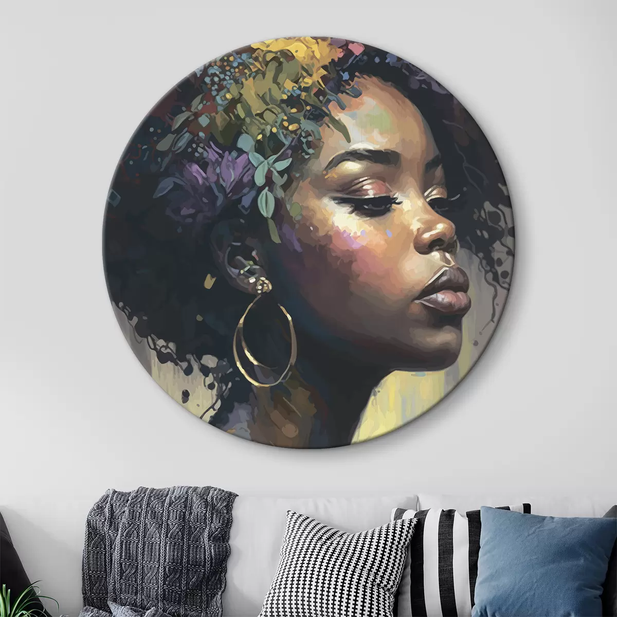 Ronde schilderijen Mooie zwarte vrouw met gekleurd haar Nr r36577