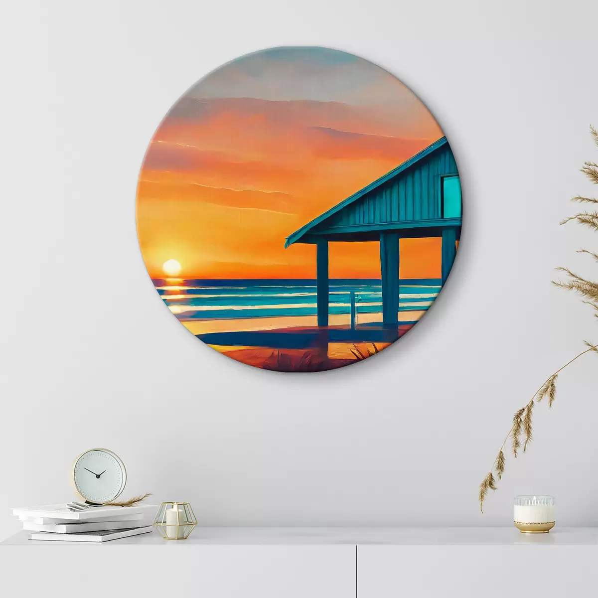 Ronde schilderijen Kleuren van zonsondergang bij een huisje aan de oceaan r36580