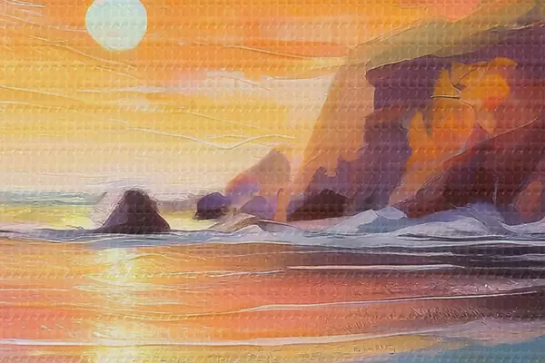 Ronde schilderijen Zonsopgang aan de kust, zeegolven, levendige penseelstreken, acryl Nr r36581