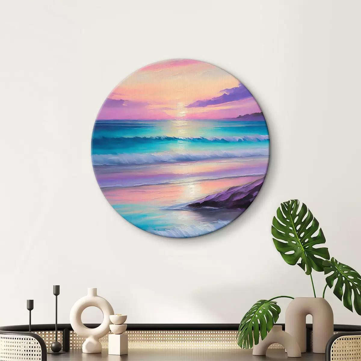 Ronde schilderijen Zachte paarse zonsondergang aan de zeekust, acryl tekening, gezellige strandsfeer r36590